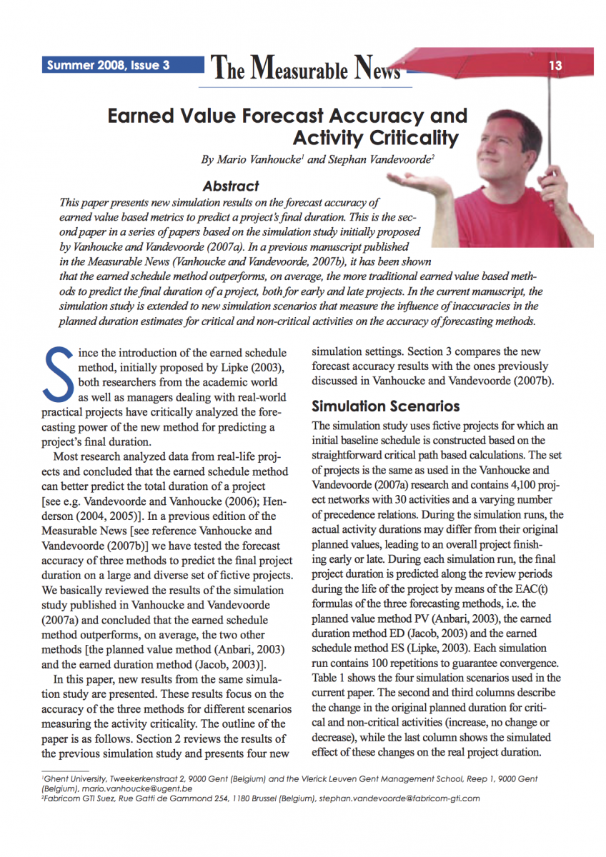 In this article, published in 2008 in The Measurable News, the forecasting accuracy of three time predictors using the earned value and earned schedule methodology is compared and validated. It is a follow-up article of “TMN, Winter 2007: Measuring the accuracy of earned value/earned schedule forecasting predictors” and makes a distinction between critical and non-critical activities, resulting in four simulation scenarios. The main reason why a distinction between critical and non-critical activities is made is to test the performance of earned value based time predictors when used on high levels in the Work Breakdown Structure (WBS). Since the use of these predictors on high WBS levels can potentially mask potential problems and lead to wrong forecasts, this study shows how accurate they perform, despite this error.