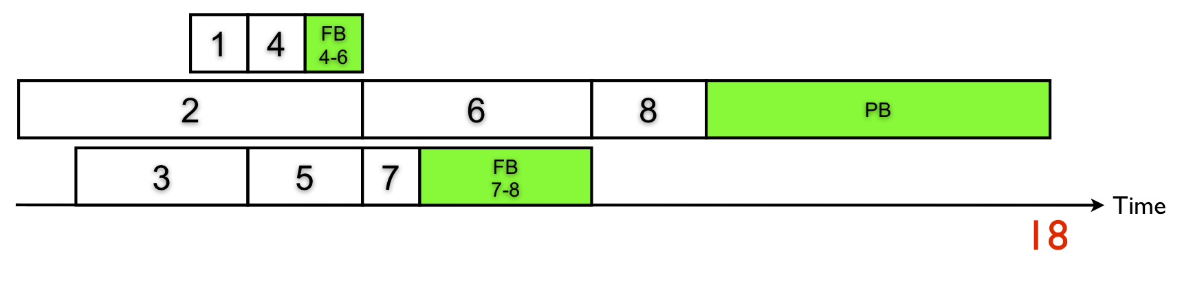 Each buffer needs to be sized according to a predefined sizing method (see “Critical Chain/Buffer Management: Sizing project and feeding buffers”) and will therefore consume time. In figure 2, the buffered schedule is displayed using the cut and paste method (see “Sizing CC/BM buffers: The cut and paste method”) to determine the size of the buffers. Obviously, the buffered schedule has a longer duration (18 time units) than the unbuffered schedule displayed in figure 1 (12 time units). Since the resource buffer is nothing more than a warning signal and does not consume time, it has not been displayed in the buffered schedule.