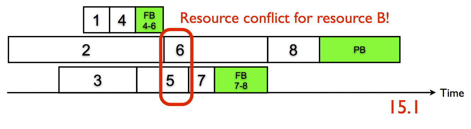 The project duration of the buffered schedule is equal to 15.1 time units (e.g. days) but shows a resource conflict for resource B. Since the availability of this resource is equal to 1 and the resource is used by both activities 5 and 6, there is a time period where resource B is used twice. This resource conflict caused by the shift of activity 5 leads to a buffered schedule which is no longer resource feasible.