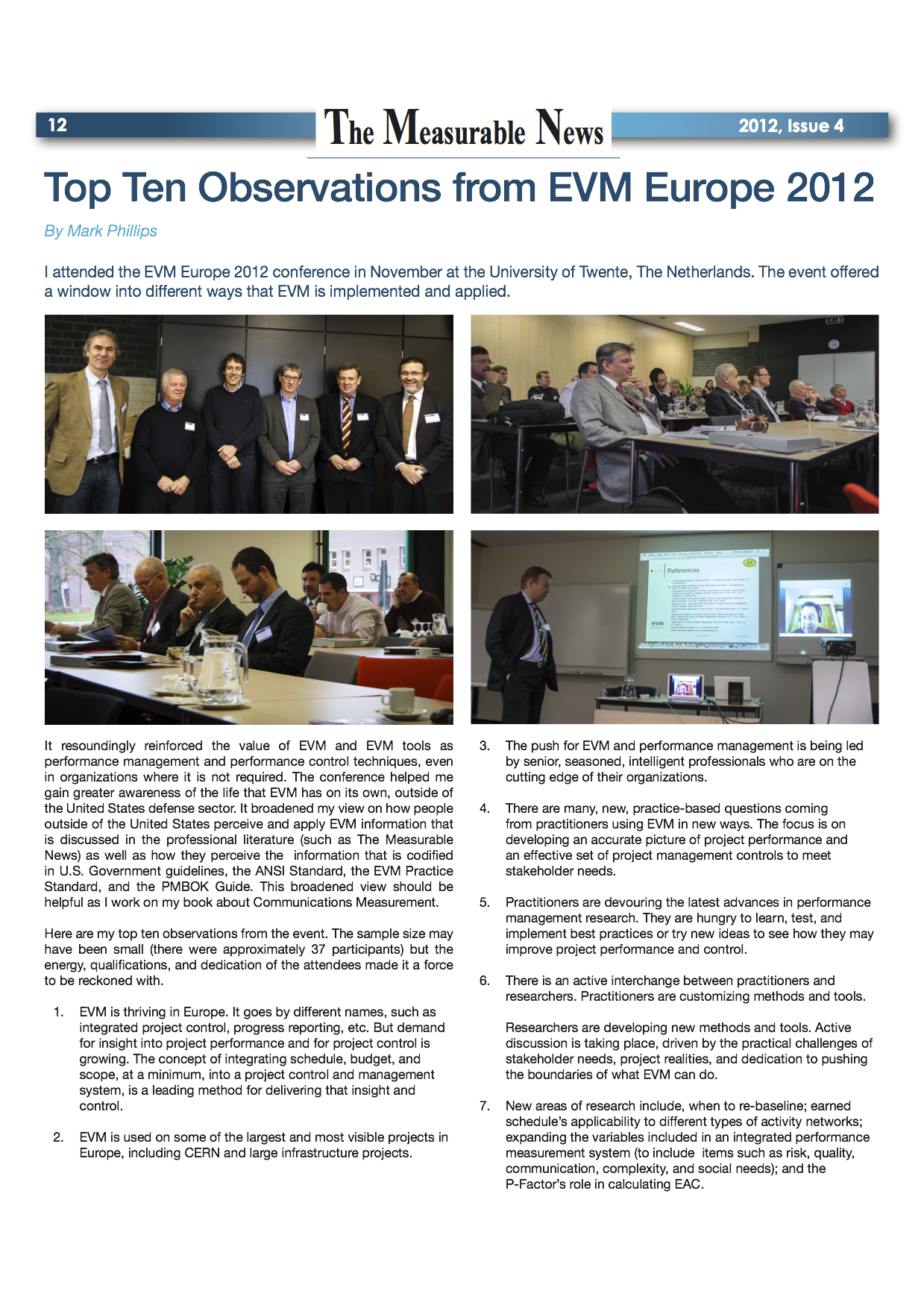 Read the complete article by downloading the press release written by Mark Phillips, CPM Vice President, Communications of the College of Performance Management published in The Measurable News, Issue 4 of 2012. Visit the EVM Europe website for the latest information.